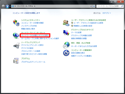 2. 「コントロールパネル」画面が表示されますので、【ネットワークの状態とタスクの表示】をクリックしてください。